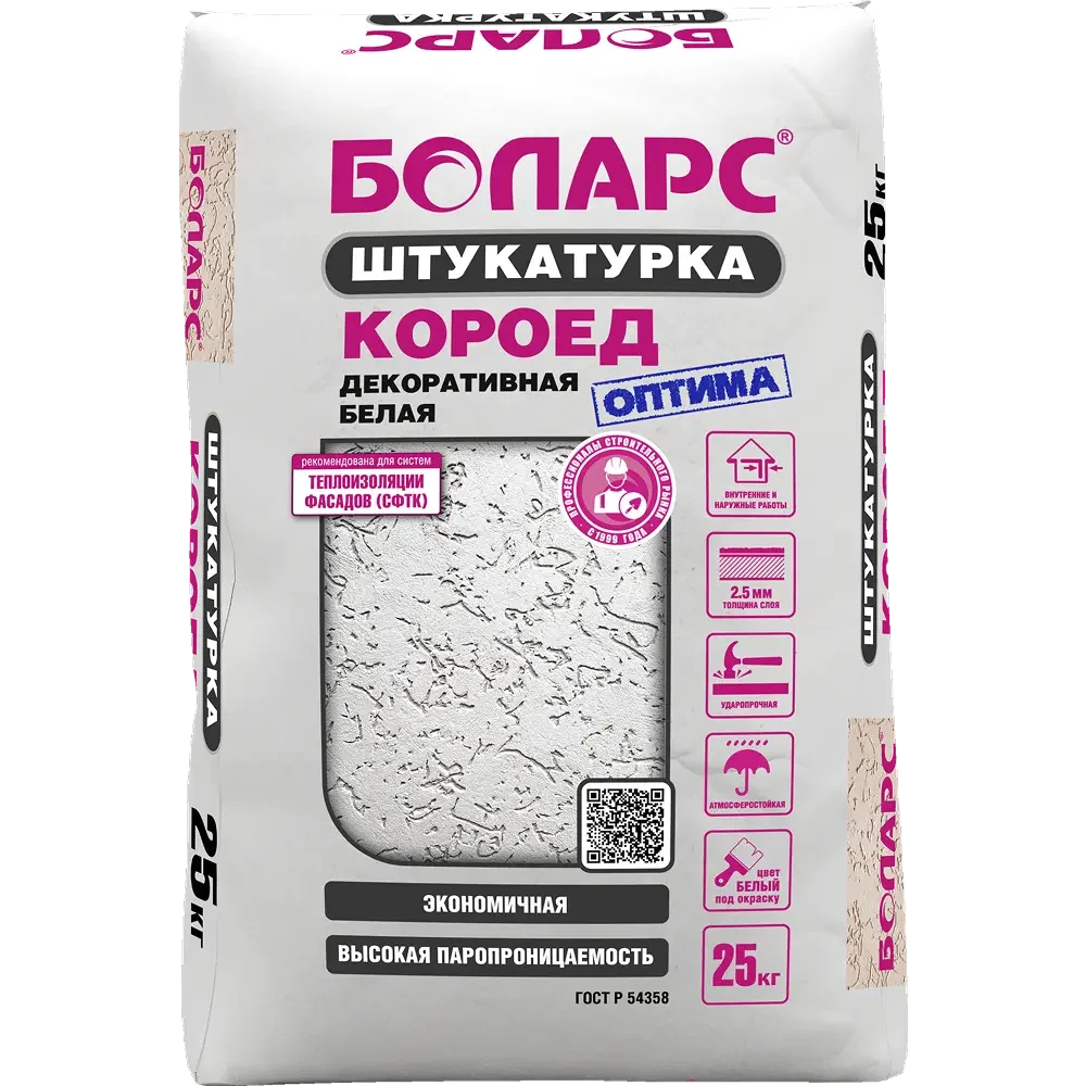 БОЛАРС Декоративная штукатурка КОРОЕД ОПТИМА (2,5мм) 25 кг — материал для отделочных работ для подготовки, укладки и финишной отделки поверхностей.