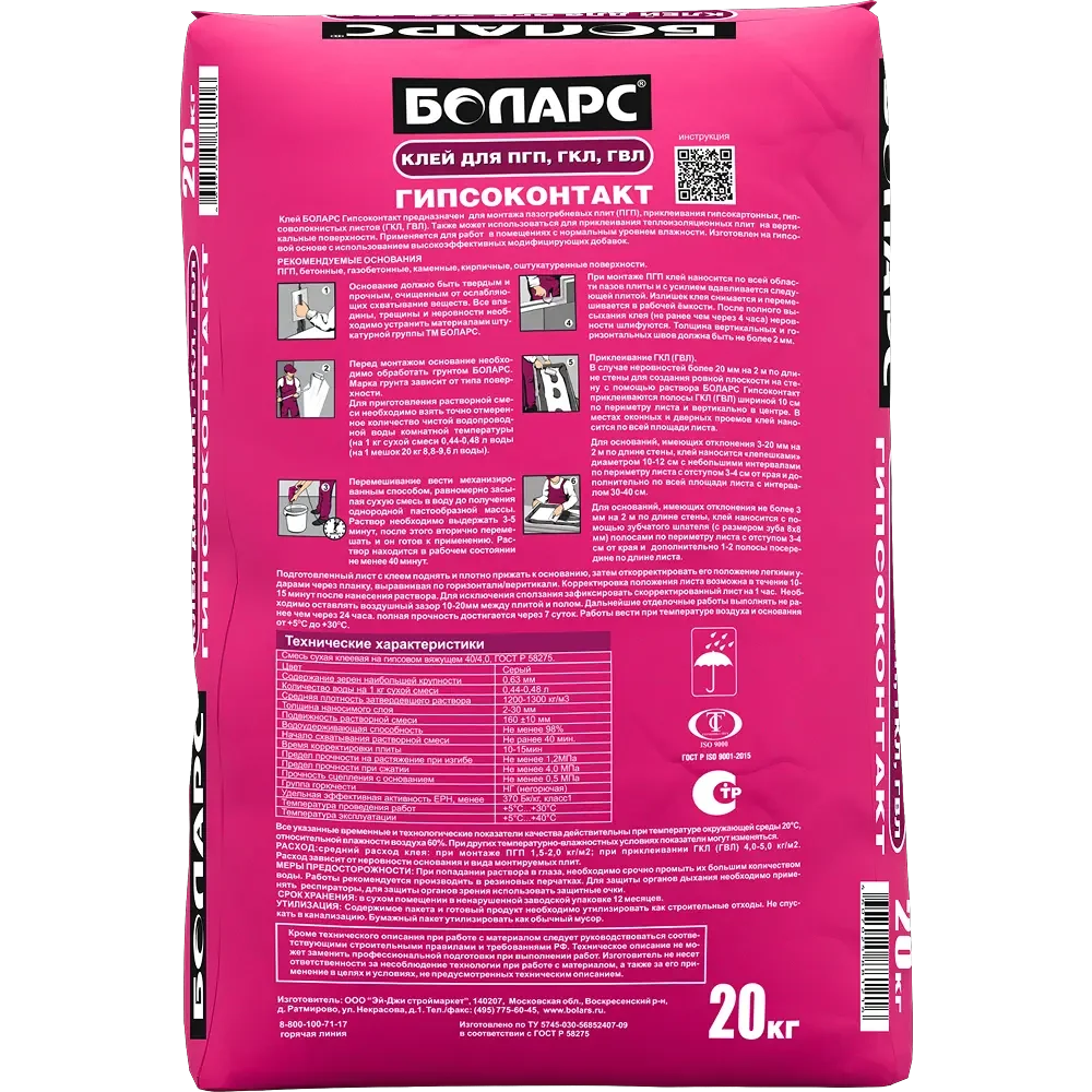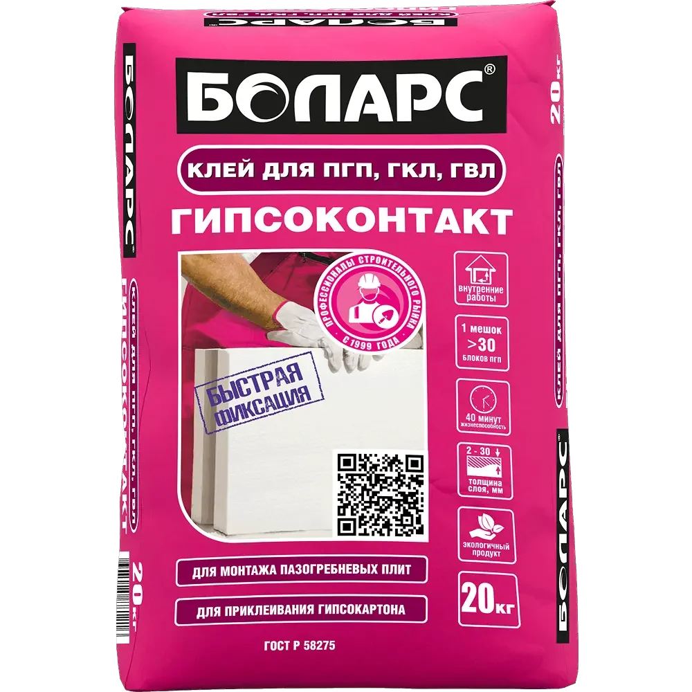 БОЛАРС Клей для ПГП ГИПСОКОНТАКТ 20 кг — материал для отделочных работ для подготовки, укладки и финишной отделки поверхностей.