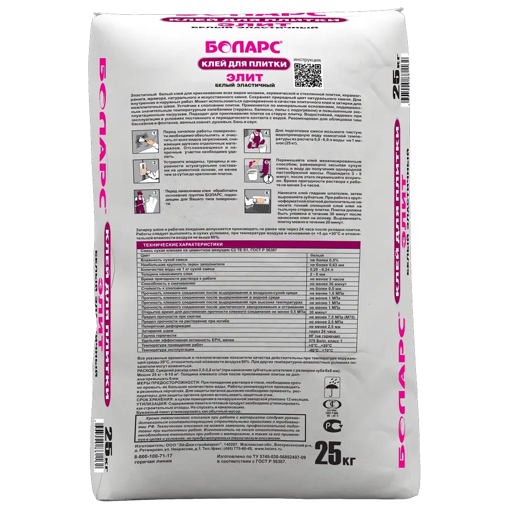 БОЛАРС Клей для плитки ЭЛИТ (С2 ТЕ S1) 25 кг — материал для отделочных работ для подготовки, укладки и финишной отделки поверхностей.