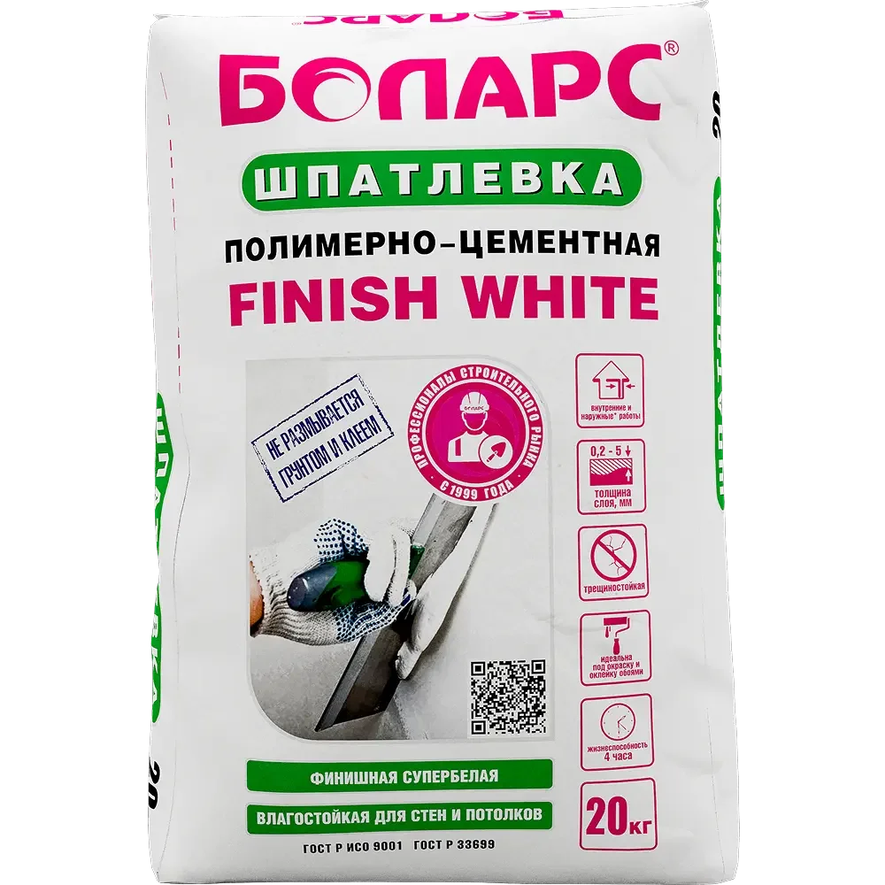 БОЛАРС Шпатлевка полимерно-цементная Finish White — материал для отделочных работ для подготовки, укладки и финишной отделки поверхностей.
