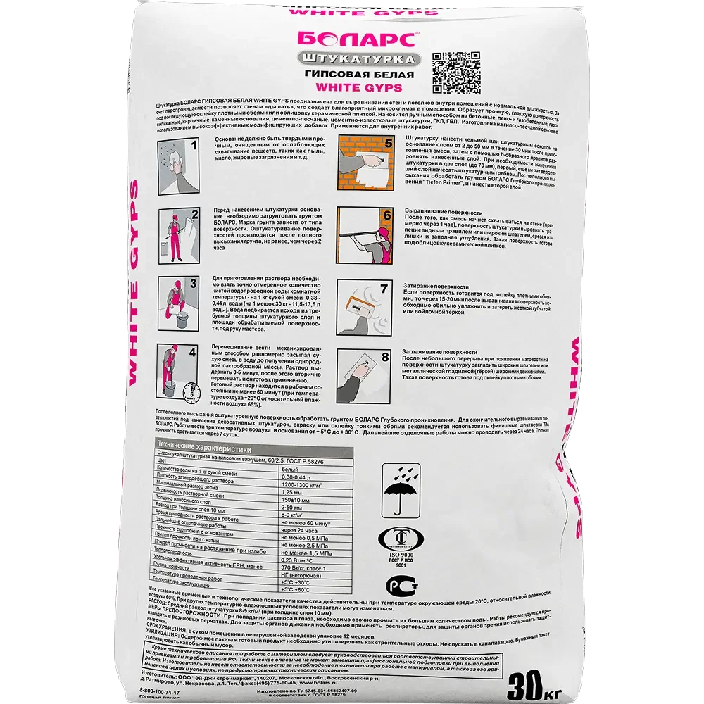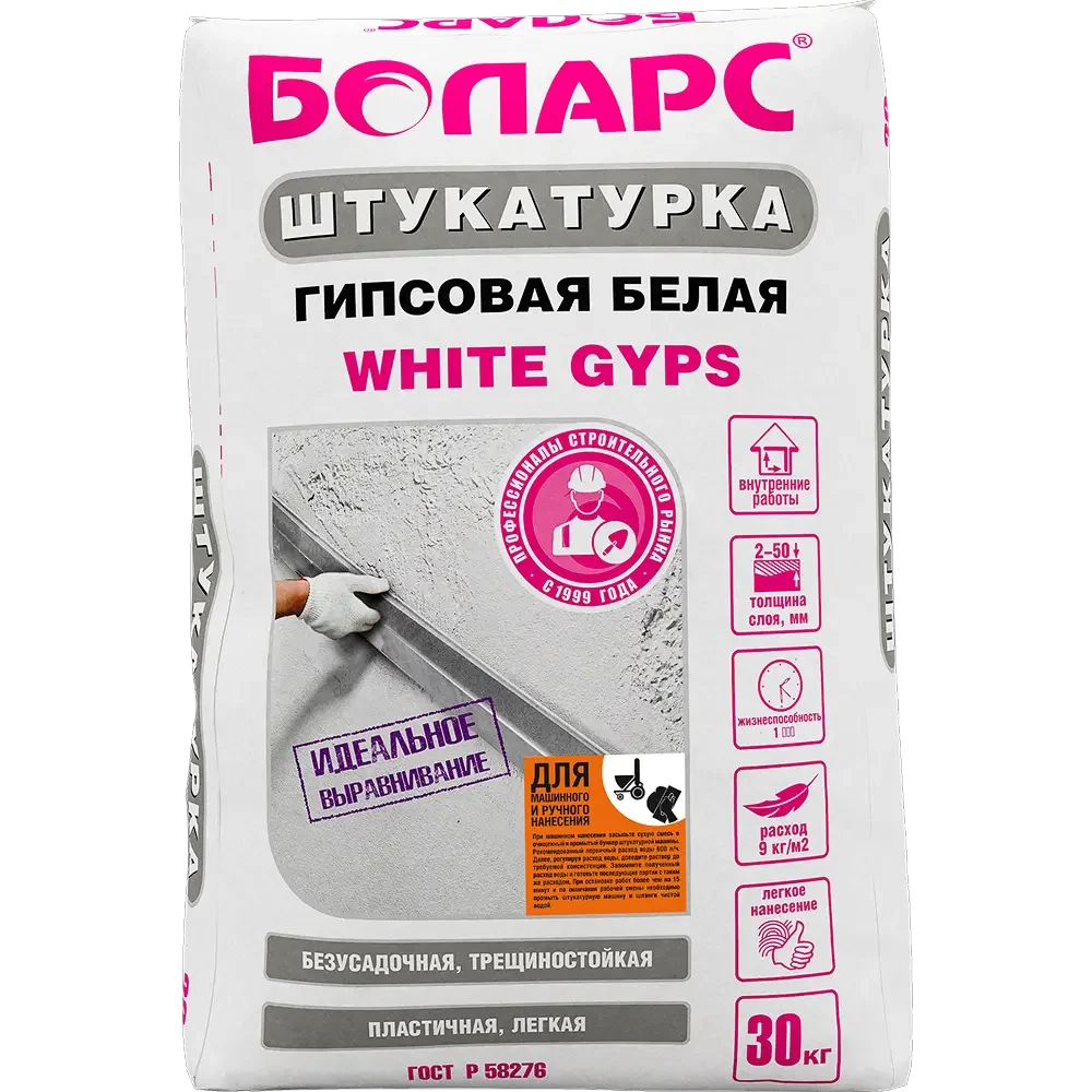 БОЛАРС Штукатурка гипсовая белая WHITE GYPS 30 кг — материал для отделочных работ для подготовки, укладки и финишной отделки поверхностей.