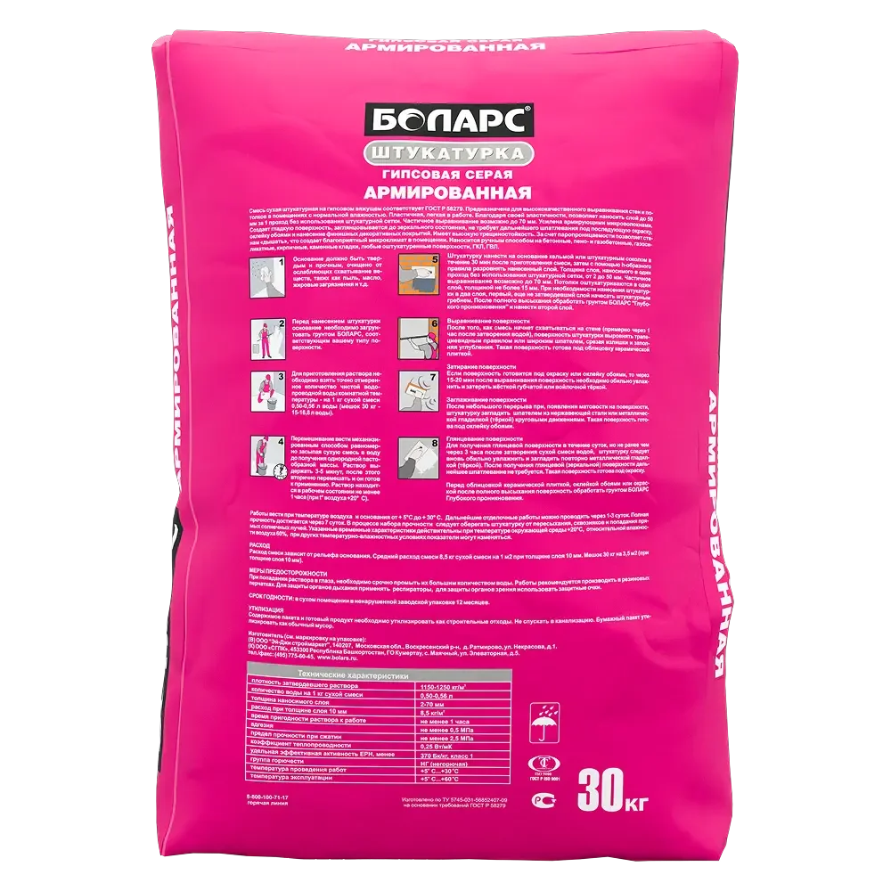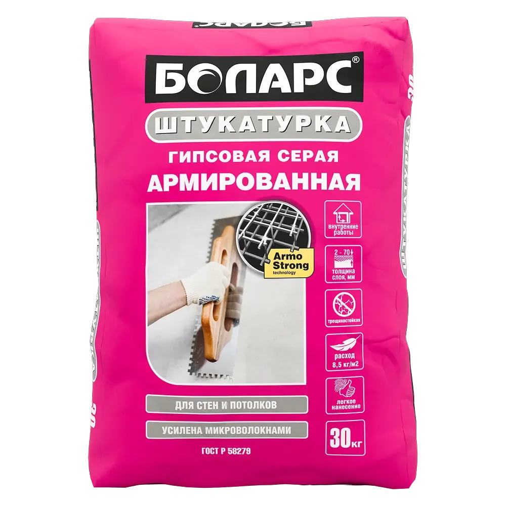 БОЛАРС Штукатурка гипсовая серая АРМИРОВАННАЯ 30 кг — материал для отделочных работ для подготовки, укладки и финишной отделки поверхностей.