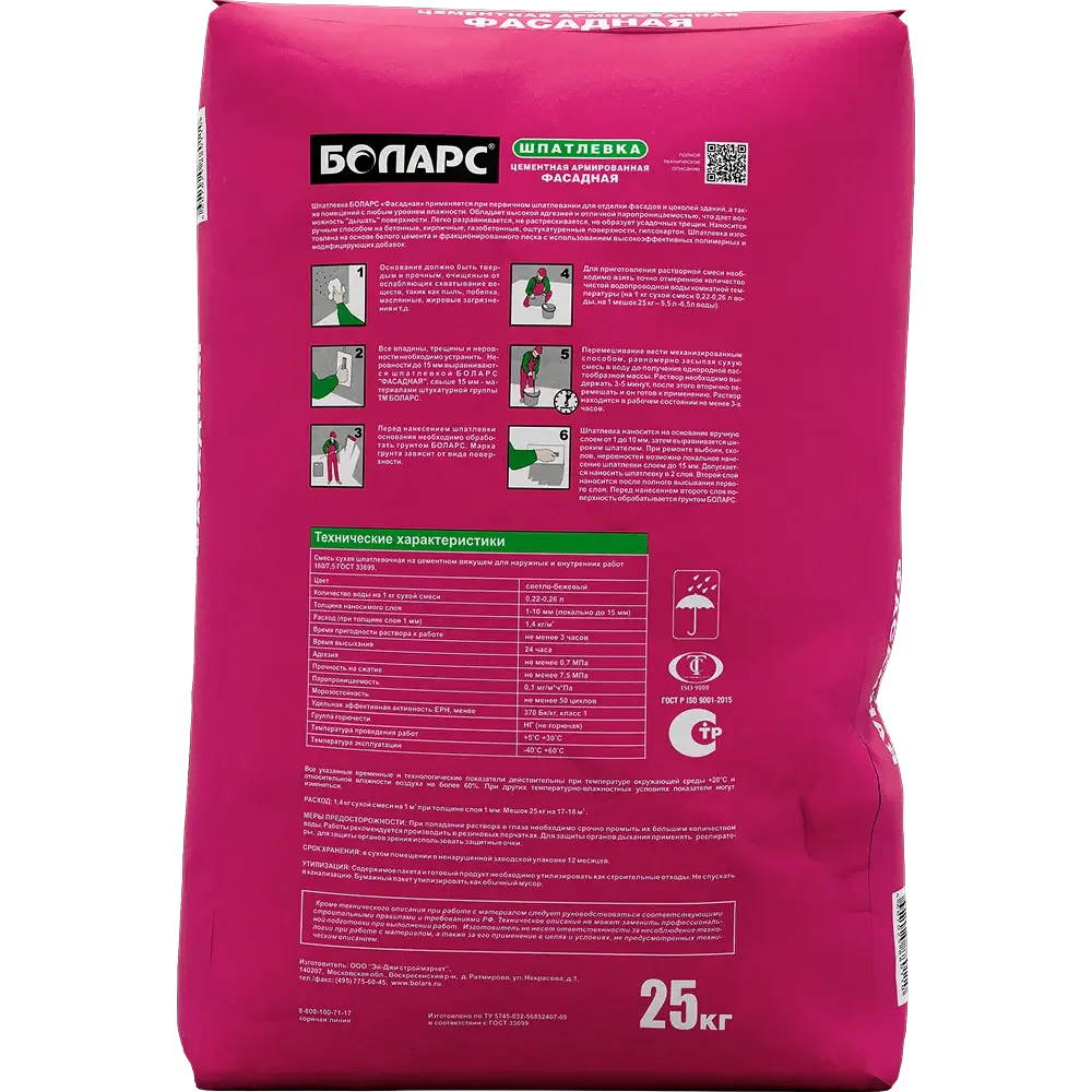 БОЛАРС Штукатурка цементная ФАСАДНАЯ 25 кг — материал для отделочных работ для подготовки, укладки и финишной отделки поверхностей.