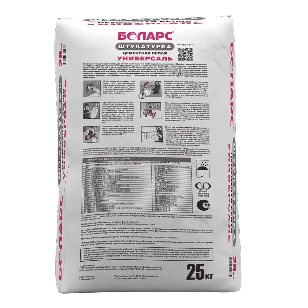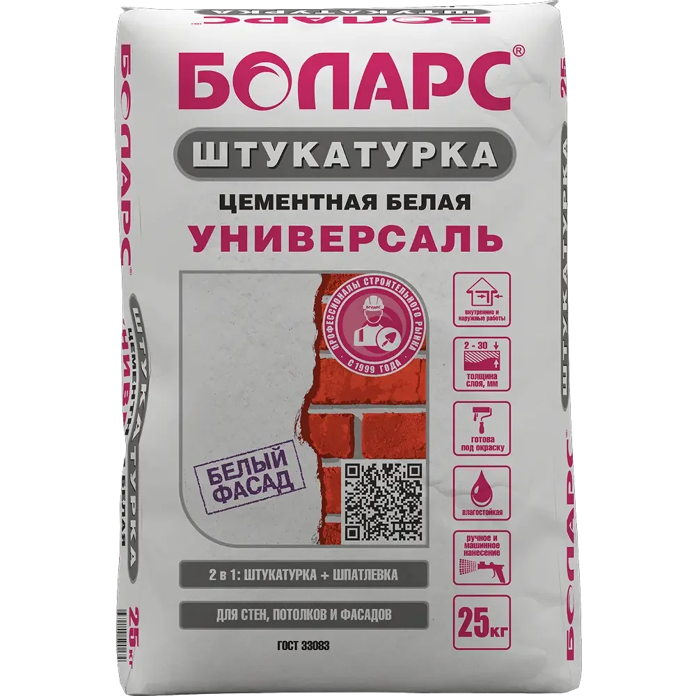 БОЛАРС Штукатурка цементная УНИВЕРСАЛЬ БЕЛАЯ 25 кг — материал для отделочных работ для подготовки, укладки и финишной отделки поверхностей.
