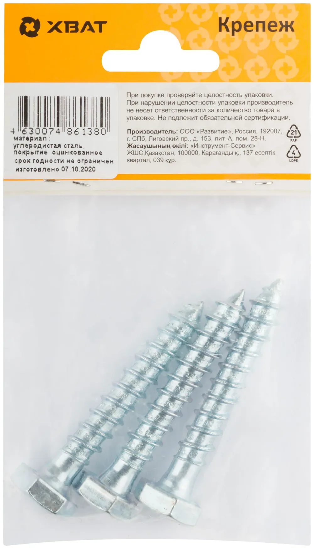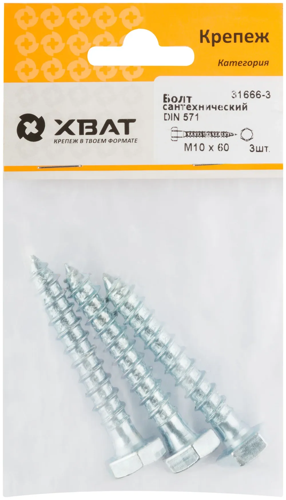 Болт сантехнический DIN 571 10/60 (фасовка 3 10.) — крепёжный элемент для монтажа, фиксации и сборки конструкций.