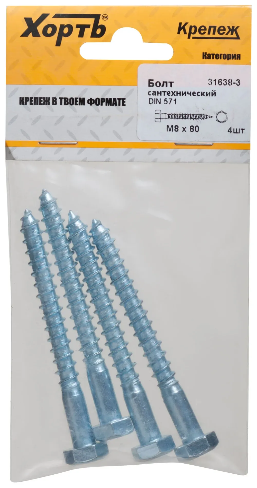 Болт сантехнический DIN 571 8/80 (фасовка 4 10.) — крепёжный элемент для монтажа, фиксации и сборки конструкций.
