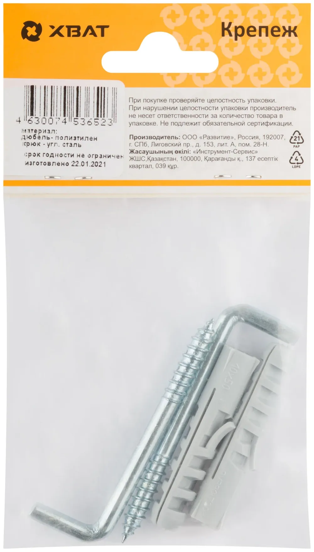 Дюбель с крюком 10х50/6х68 (фасовка по 2 10.) — крепёжный элемент для монтажа, фиксации и сборки конструкций.