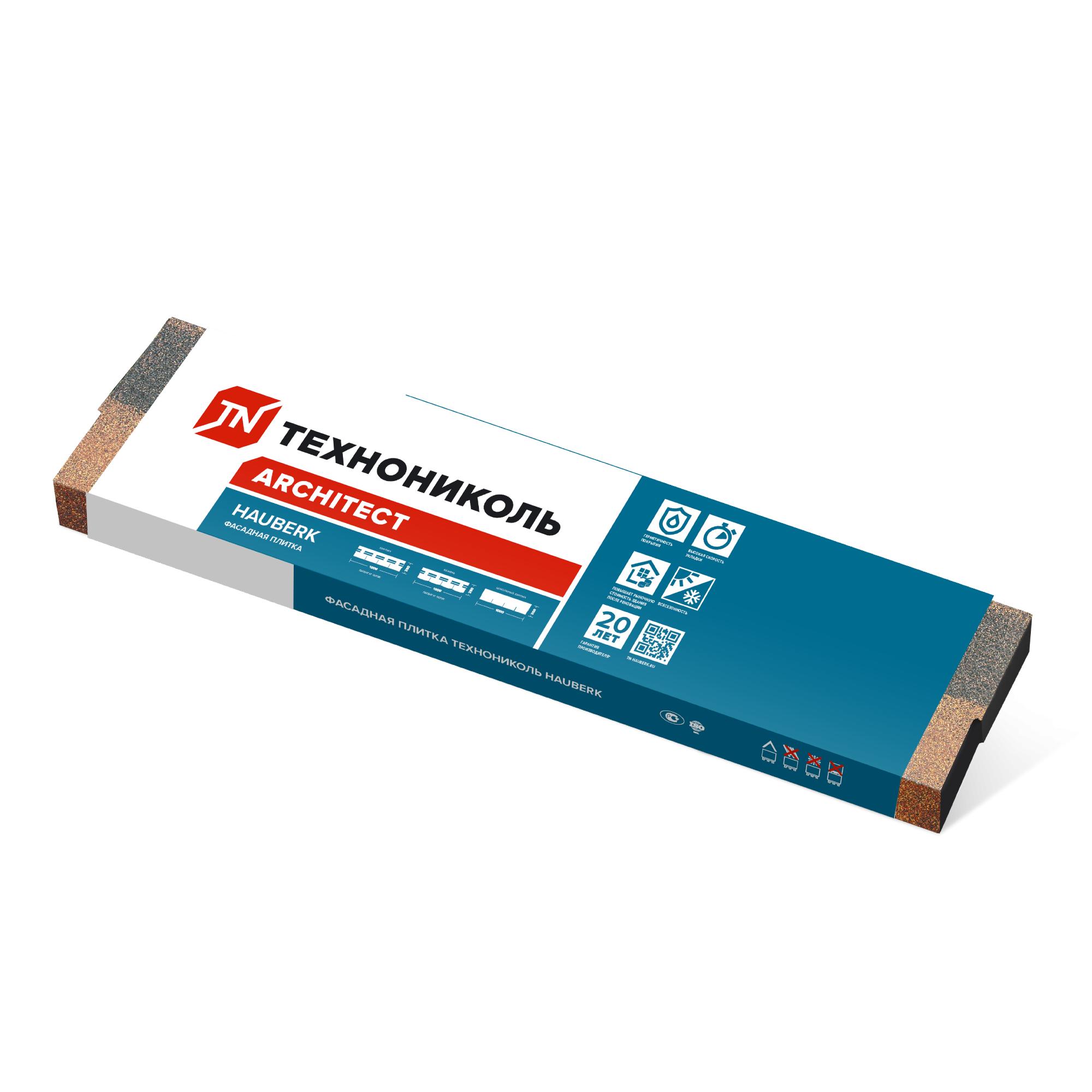 Фасадная плитка ТЕХНОНИКОЛЬ HAUBERK производится на основе стеклохолста, пропитанного битумом, модифицированным СБС. Лицевая сторона материала имеет декоративное покрытие из базальтового гранулята, а тыльная сторона посыпана кварцевым песком.