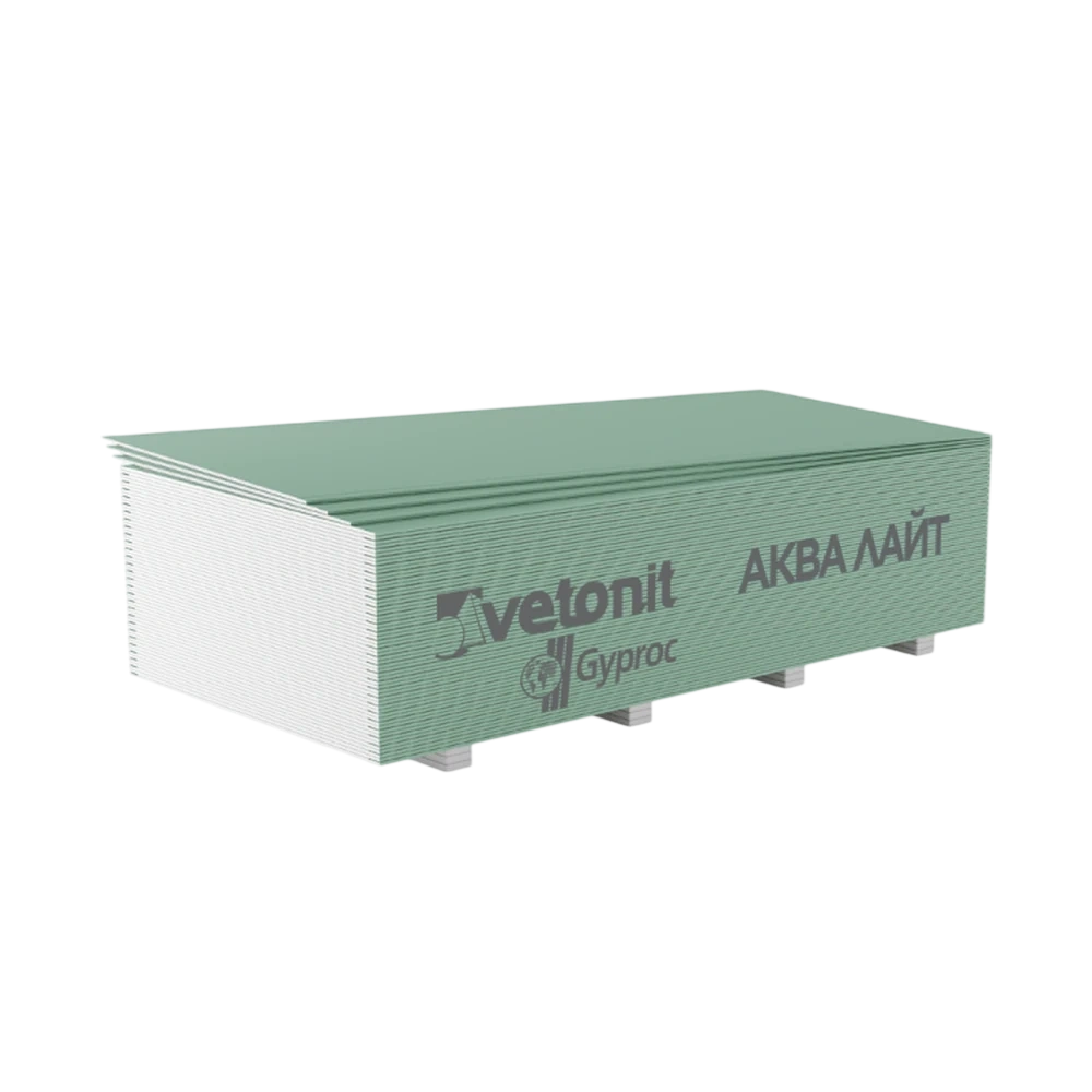 Vetonit Gyproc Аква Лайт 2500х1200х9,5 мм — облегчённый влагостойкий лист для потолков и лёгких конструкций во влажных помещениях. Подходит для внутренних работ и последующей отделки. Источник характеристик линейки: https://www.gyproc.ru/produkciya/gipsovye-stroitelnye-plity/gsp-vetonit-gyproc-akva-layt-3000kh1200kh95-mm