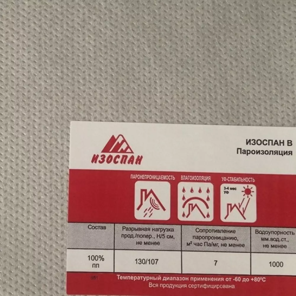 Изоспан В представляет собой двухслойный материал, состоящий из нетканого полипропиленового полотна и полипропиленовой пленки. Одна сторона этого материала обладает гладкой текстурой, в то время как другая — шероховатой. Шершавая поверхность Изоспан В помогает снизить вероятность капель конденсата, падающих на внутреннюю отделку.