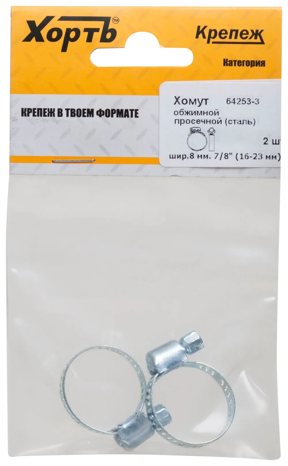 Хомут обжимной просечной (оцинкованная сталь) шир.8 мм. 7/8" (16-23 мм) (фасовка 2 10.) — крепёжный элемент для монтажа, фиксации и сборки конструкций.