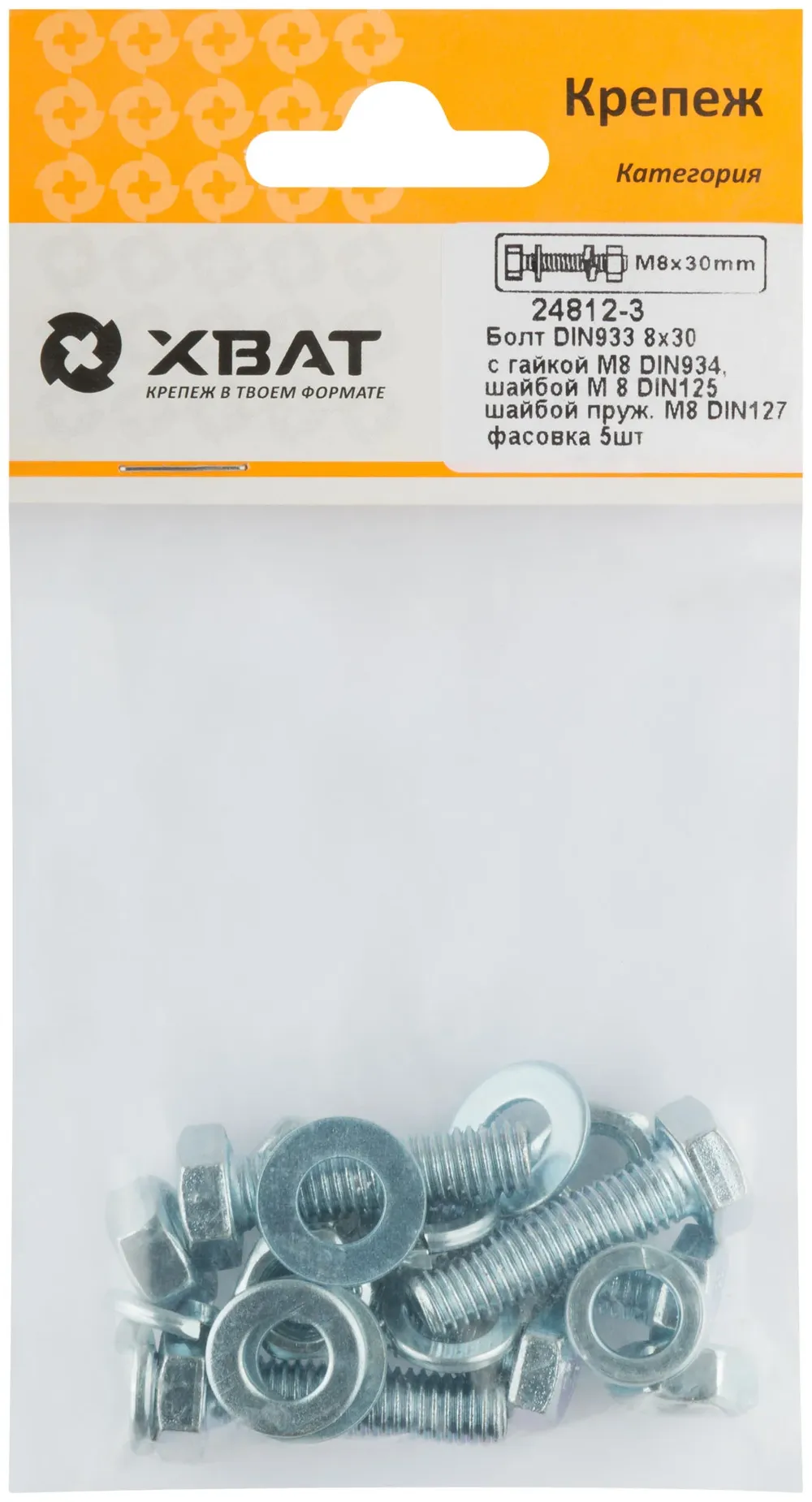 Комплект:Болт DIN933 8х30, с гайкой М8 DIN934, шайбой М 8 DIN125, шайбой пруж. М8 DIN127 (фасовка 5 — крепёжный элемент для монтажа, фиксации и сборки конструкций.