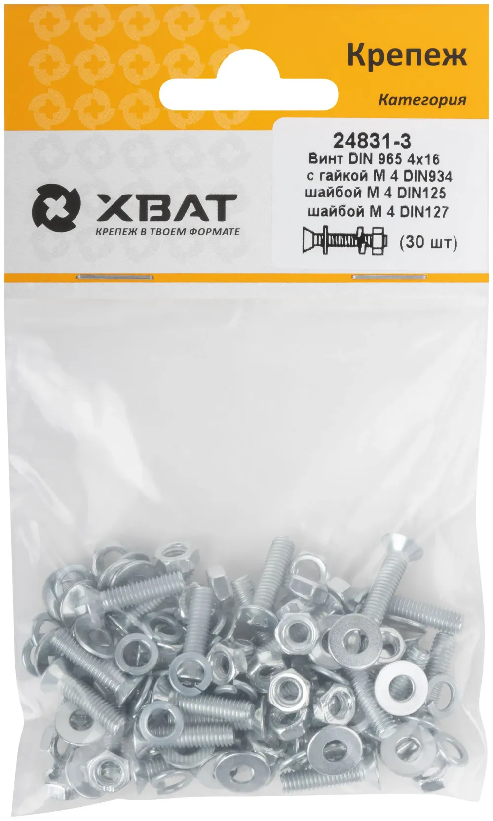 Комплект: Винт DIN965 4х16, с гайкой М4 DIN934, шайбой М 4 DIN125, шайбой М 4 DIN127 (фасовка 3010 — крепёжный элемент для монтажа, фиксации и сборки конструкций.