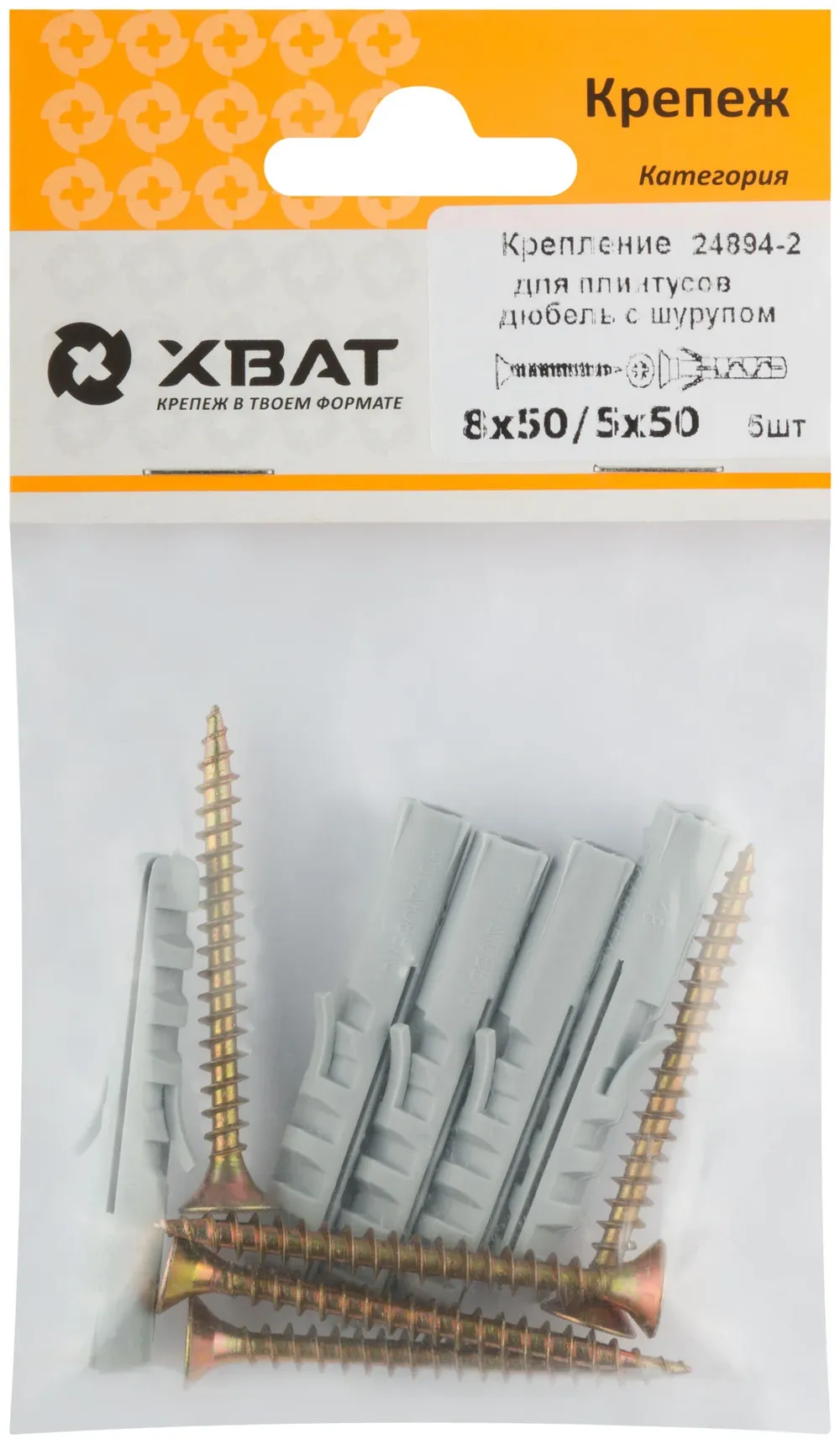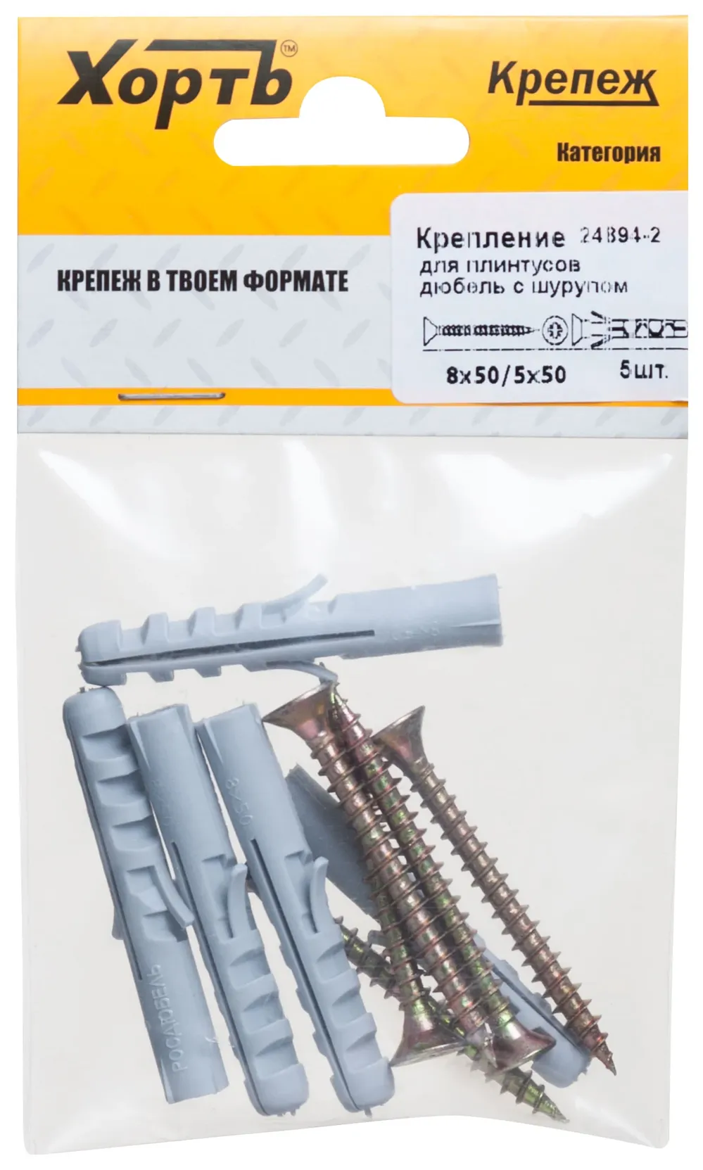 Крепление для плинтусов.Комплект: дюбель с шурупом 8х50/5х50 (фасовка 5 10.) — крепёжный элемент для монтажа, фиксации и сборки конструкций.