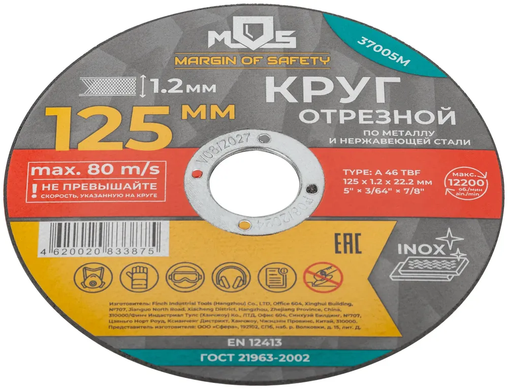 Круг отрезной по металлу MOS, посадочный диаметр 22,2 мм, 125х1,2 мм — оснастка для инструмента для сверления, резки, шлифования, зачистки и демонтажа.