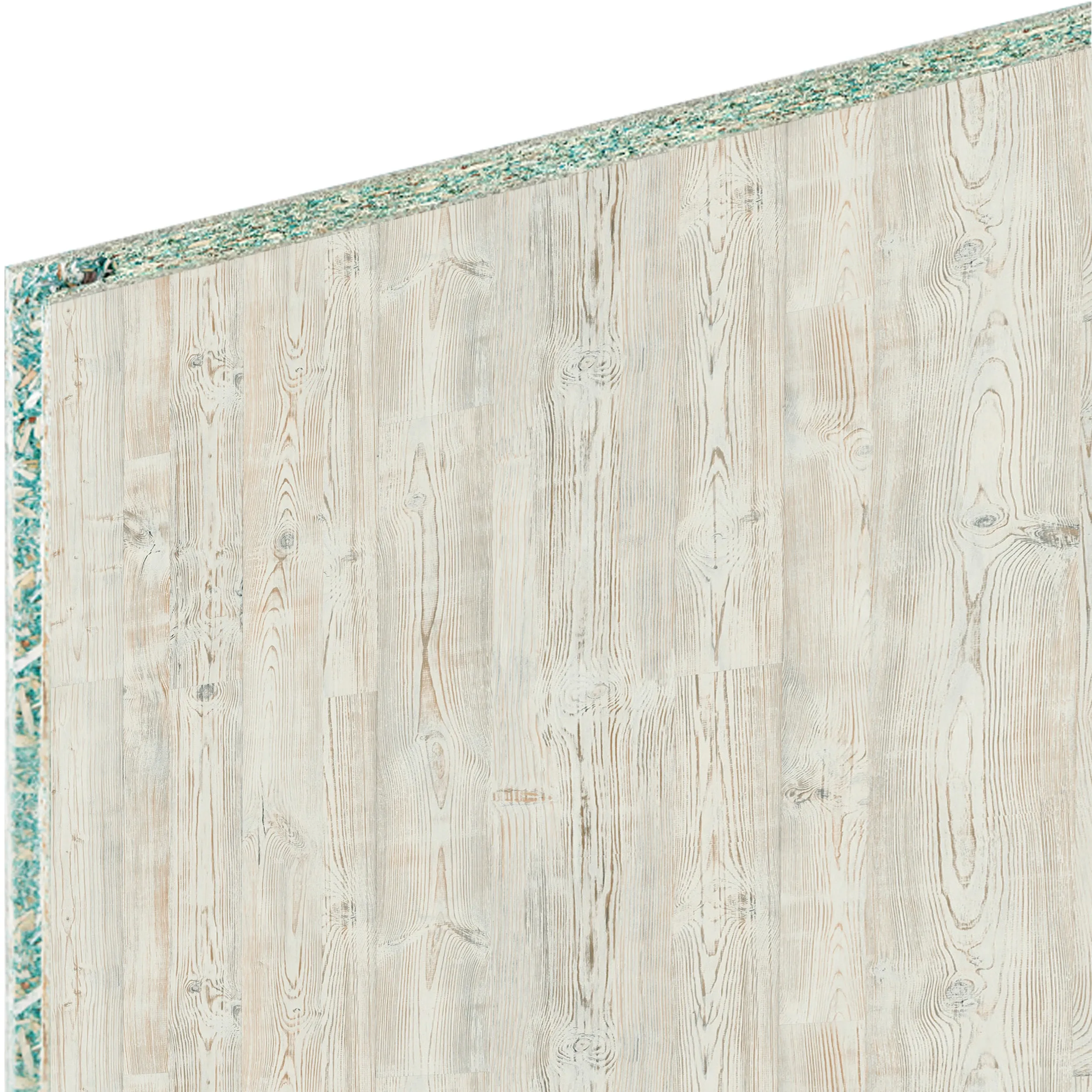 Данная композиция сформирована из досок сосны разной ширины, которые синтезируют яркую динамику и ритм, примыкая друг к другу. Визуальный эффект растрескивания усиливает естественный вид декора. В данной светлой гамме видны цветовые контрасты в сочетании теплых и холодных оттенков. Ламинированные плиты Квик Дек Наоми 1200х900х22 мм. встроенные в дизайн скромно уйдут на второй план, но вместе с этим они синтезируют основу под индивидуальный и необычный интерьер.