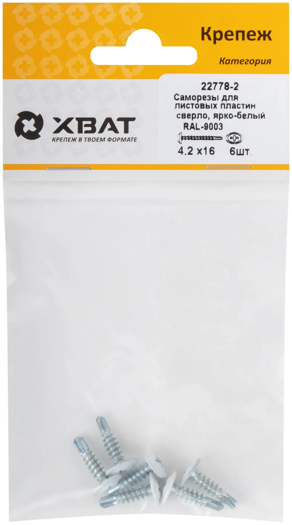 Саморезы для листовых пластин, сверло 4,2 х 16 ярко-белый, RAL 9003 (фасовка 6 шт) — крепёжный элемент для монтажа, фиксации и сборки конструкций.