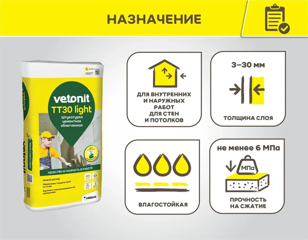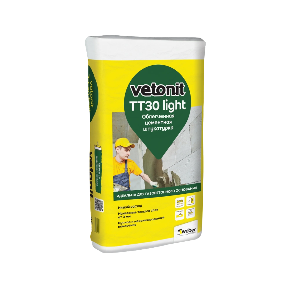 Штукатурка облегчённая Ветонит лайт Vetonit ТТ30 Light, 25 кг — материал для отделочных работ для подготовки, укладки и финишной отделки поверхностей.