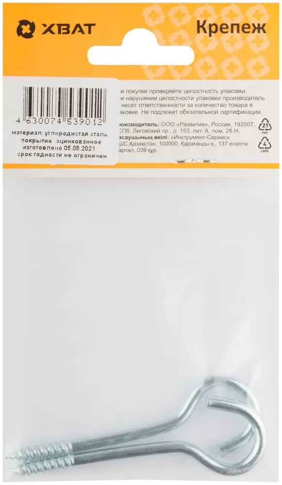 Шуруп-полукольцо оцинкованный, 5 х 75/80 (фасовка 2 10) — крепёжный элемент для монтажа, фиксации и сборки конструкций.
