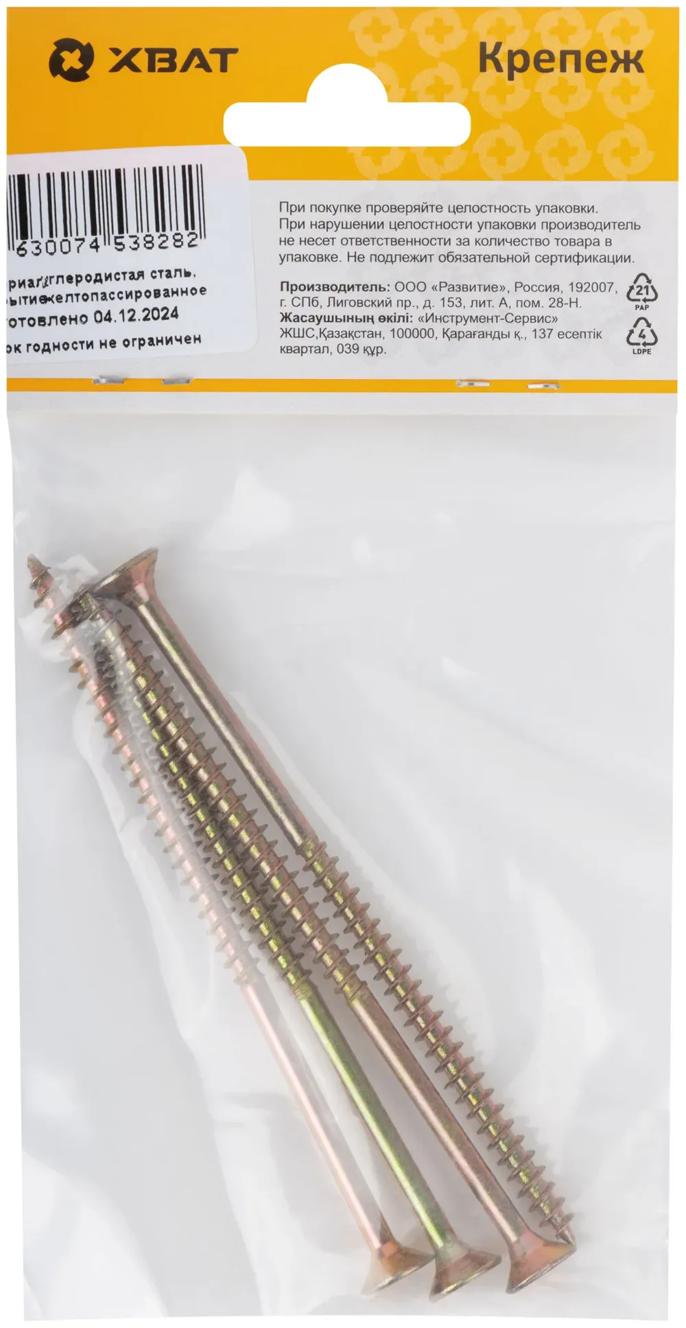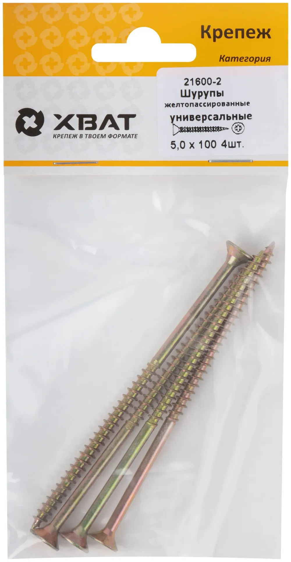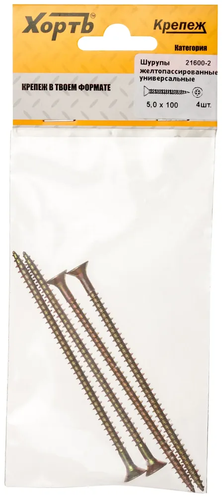 Шурупы желтопассированные, универсальные 5 х 100 ( фасовка 4 шт.) — крепёжный элемент для монтажа, фиксации и сборки конструкций.