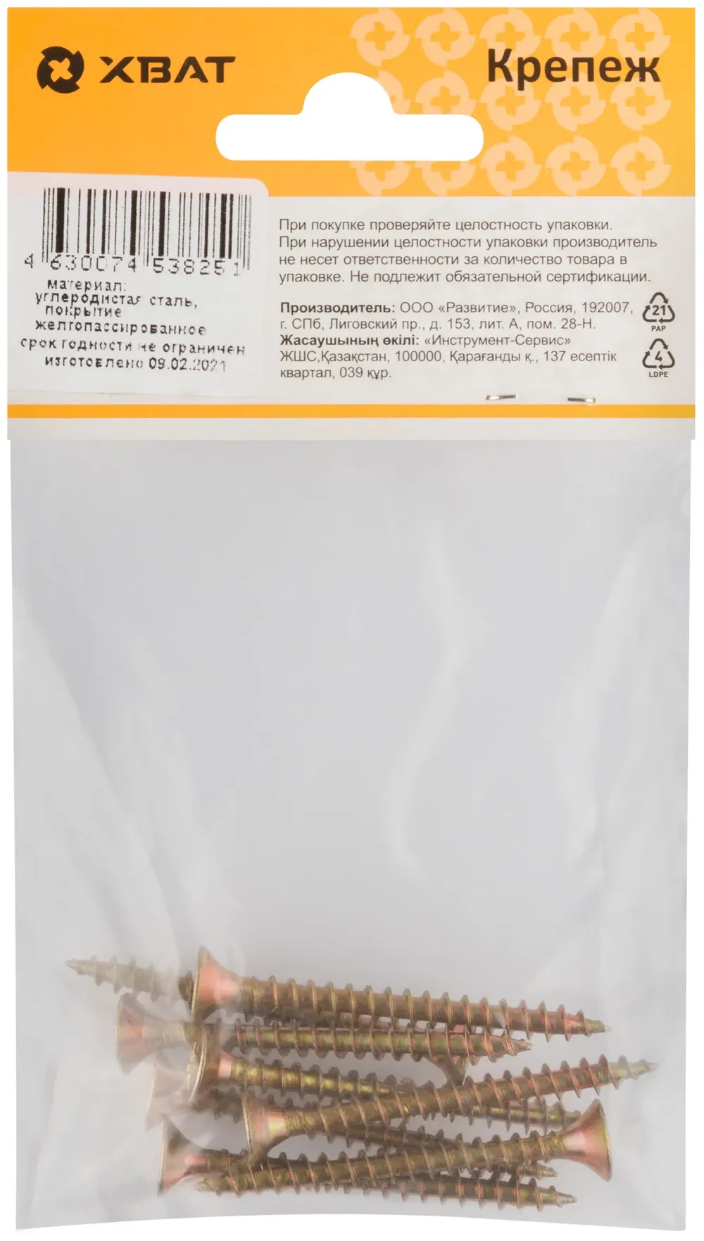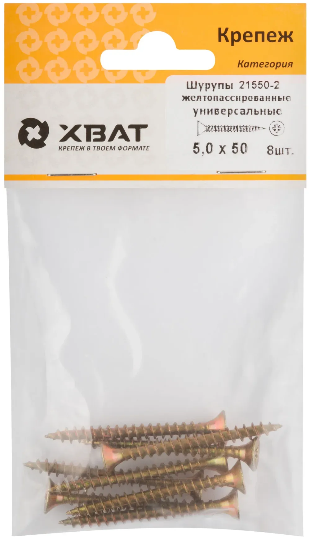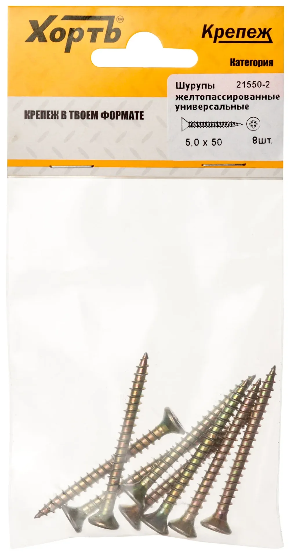 Шурупы желтопассированные, универсальные 5 х 50 ( фасовка 8 шт.) — крепёжный элемент для монтажа, фиксации и сборки конструкций.