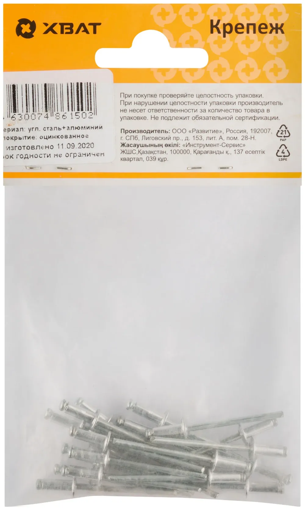 Заклепки вытяжные комбинированные, алюминий-сталь 3,2 х 8 (фасовка 20 10.) — крепёжный элемент для монтажа, фиксации и сборки конструкций.