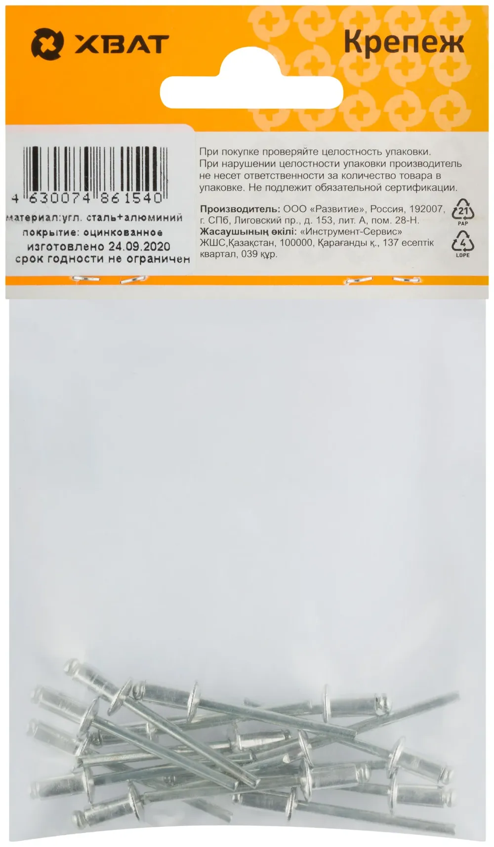 Заклепки вытяжные комбинированные, алюминий-сталь 4,0 х 8 (фасовка 15 10.) — крепёжный элемент для монтажа, фиксации и сборки конструкций.